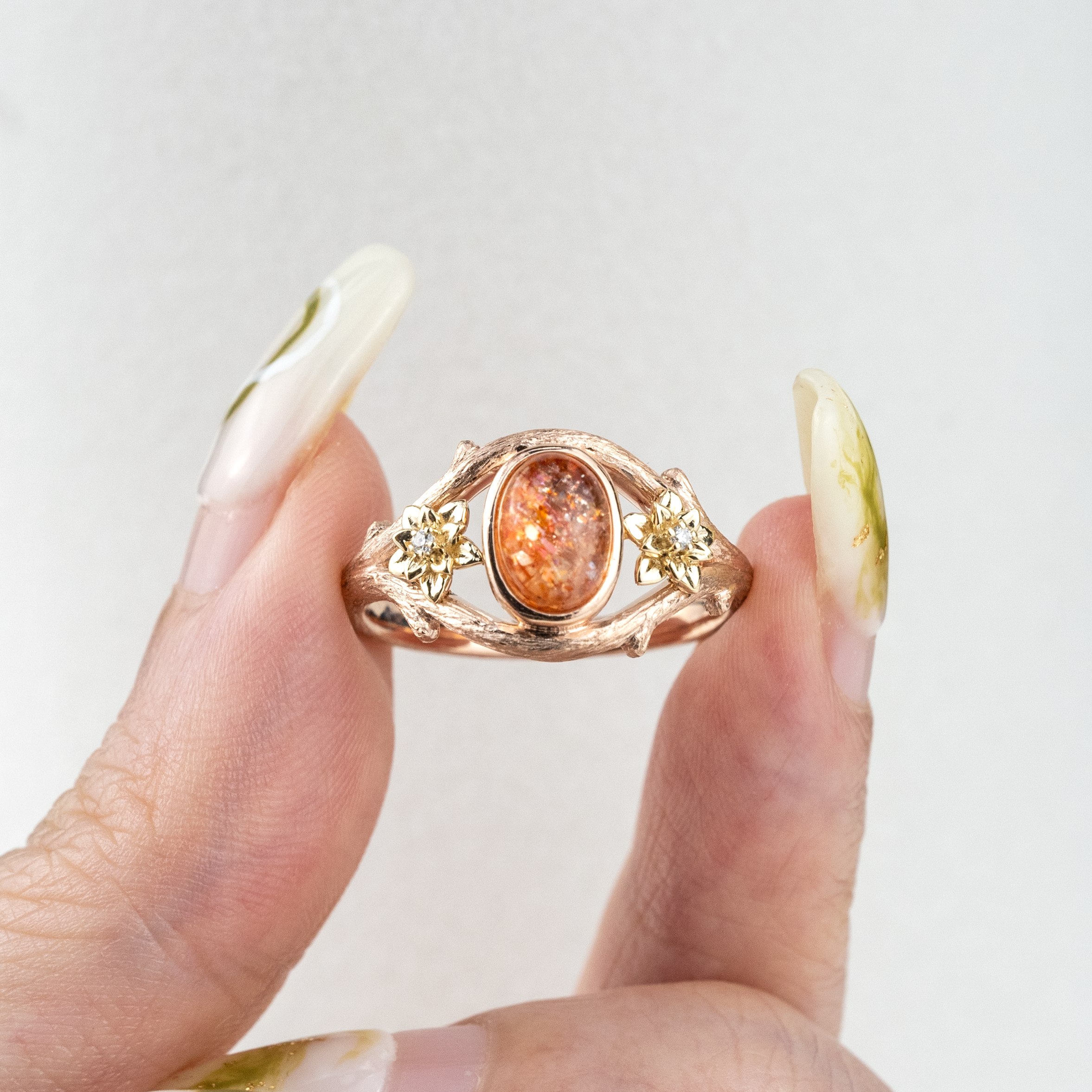Handmade Sunstone Texture Gold Leaf Ring Engagement/Wedding