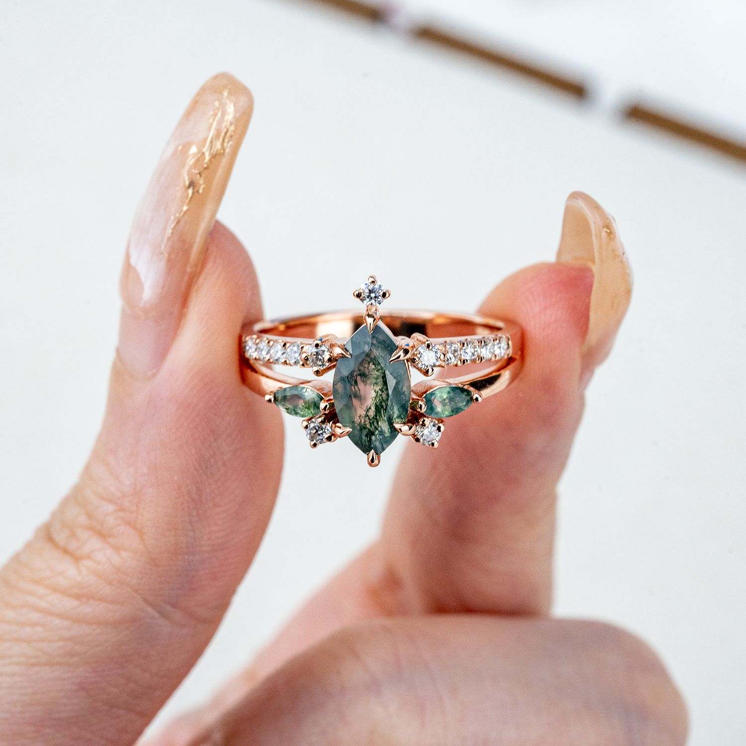 Treat yourself or a loved one to the beauty of our Rose Gold Anniversary Rings collection. Each piece showcases intricate craftsmanship and exquisite detailing inspired by nature's wonders. Our Marquise Moss Agate Ring is a standout among them, boasting a striking design that sets it apart from traditional rings. Give the gift of luxury with this breathtaking accessory.