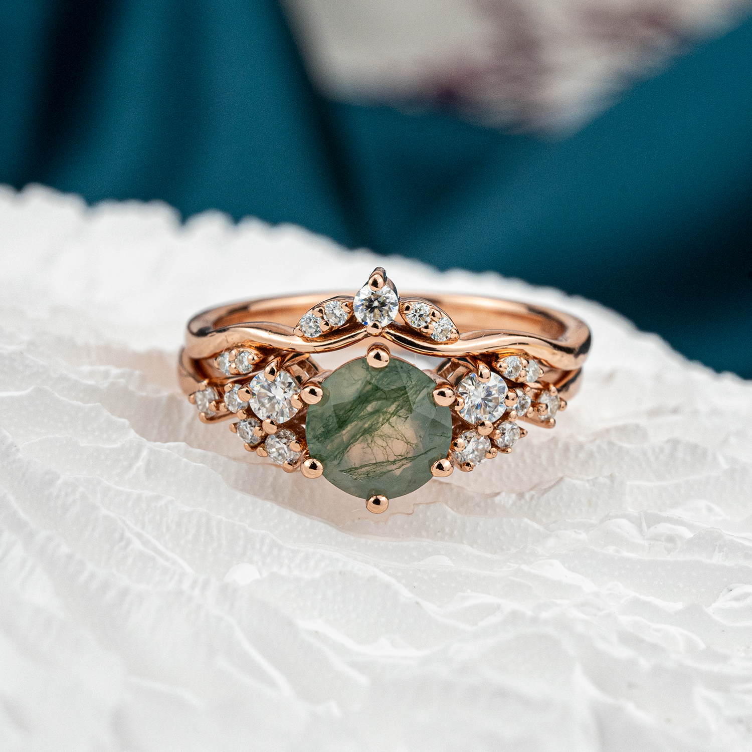Round Moss Agate Engagement Ring Set With Moissanite