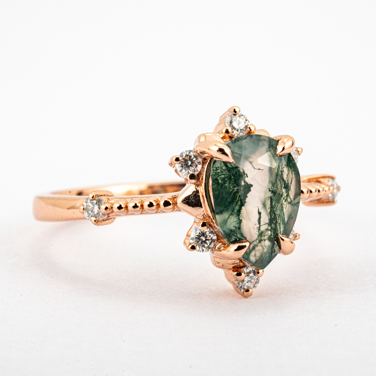 Searching for the perfect present? Look no further than our Promise Rings collection, featuring the enchanting Pear Moss Agate Ring enhanced by a radiant Moissanite stone. Make her feel cherished with this unique and creative design that speaks volumes without saying a word, an ideal gesture to show your appreciation on any occasion!