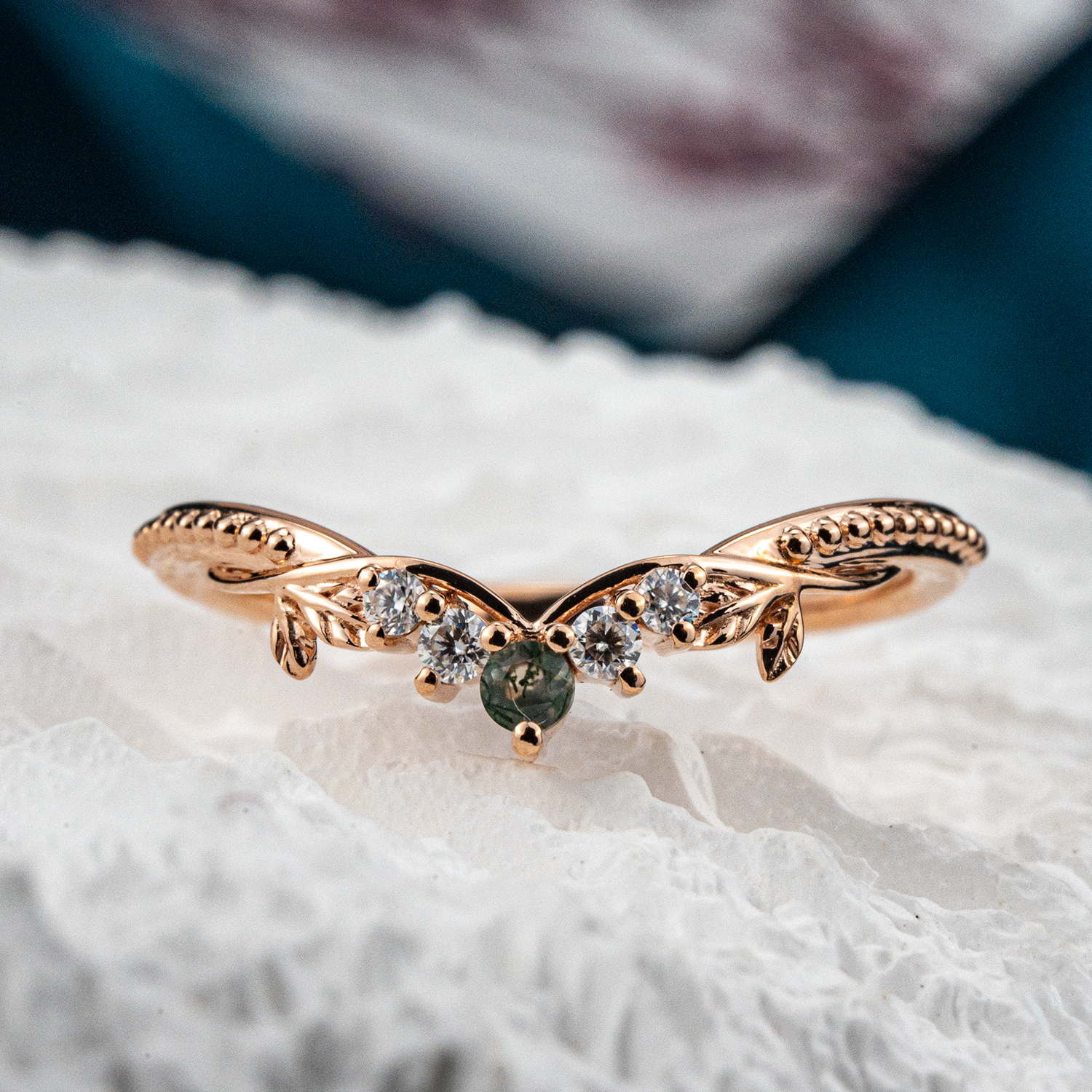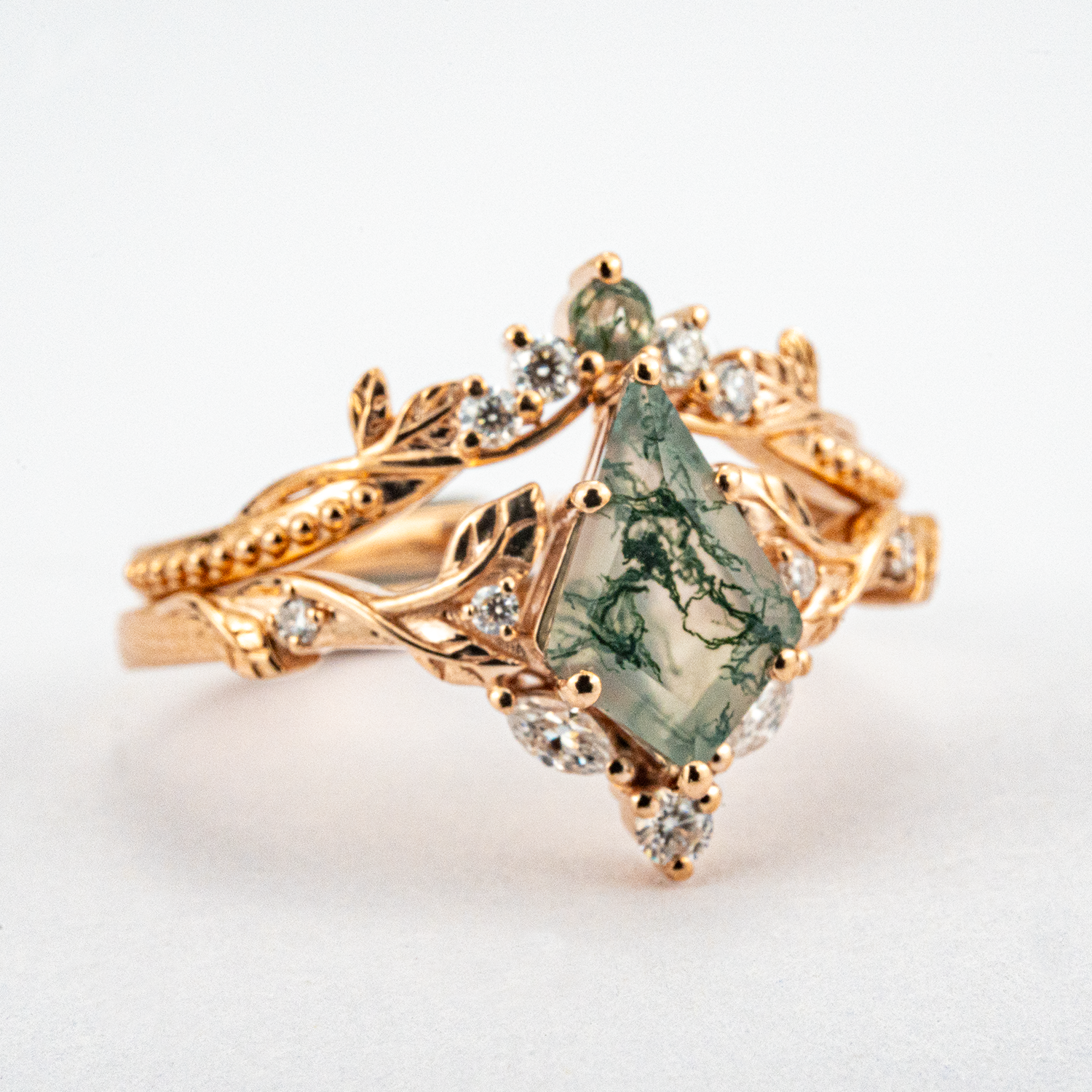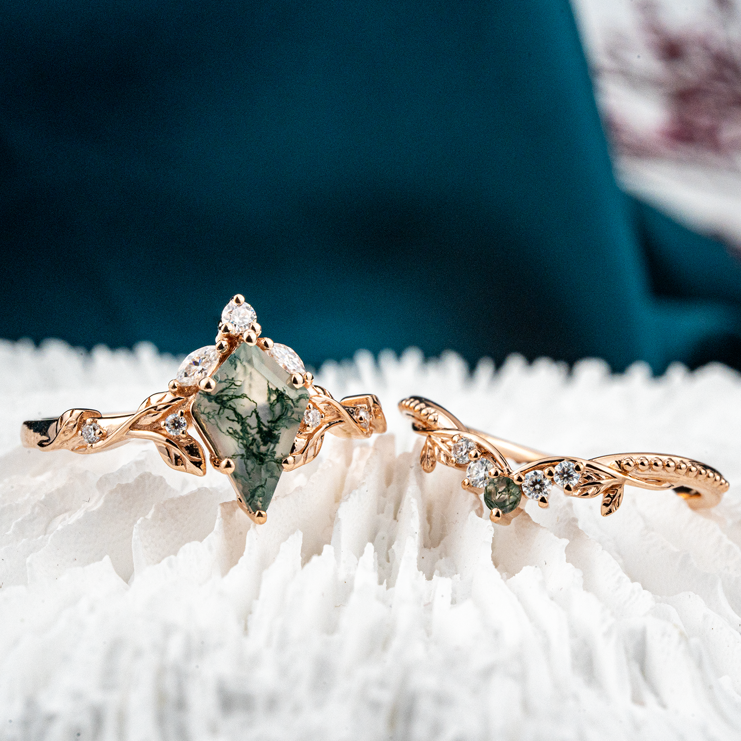 Kite Moss Agate Nature Inspired Delicate Engagement Ring Set